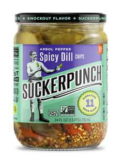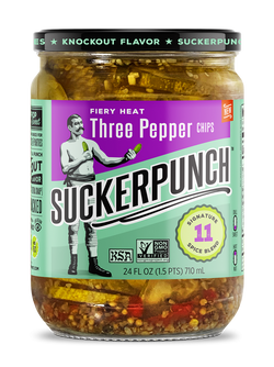 It’s time to bring the heat. Our 3-Pepper Fire Spears are just about as hot as you’d want a pickle to be! Packed with a strong snap and an even stronger kick, this spicy sweet pickle is liable to knock your block off! Brined with arbol, jalapeño, and habanero peppers, this palate-busting pickle is an incredible snack straight out of the jar and can hold its own with any meat, cheese, or cracker. If you’re looking to test your mettle, pop the lid and take a swing!